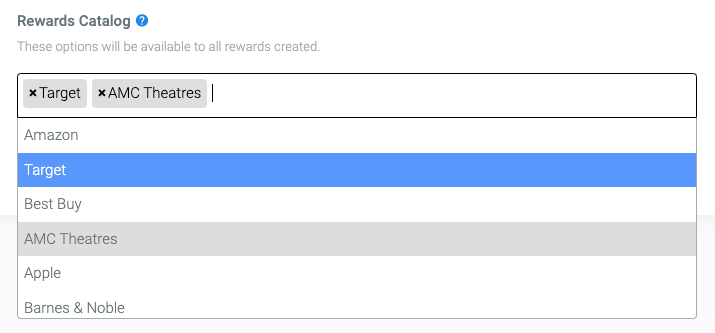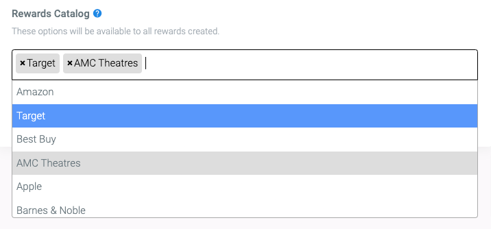 • Control reward value and catalog. Set the dollar amount and choose which digital gift cards to provide from our catalog; all options are available by default, and you can narrow to specific retailers when needed.