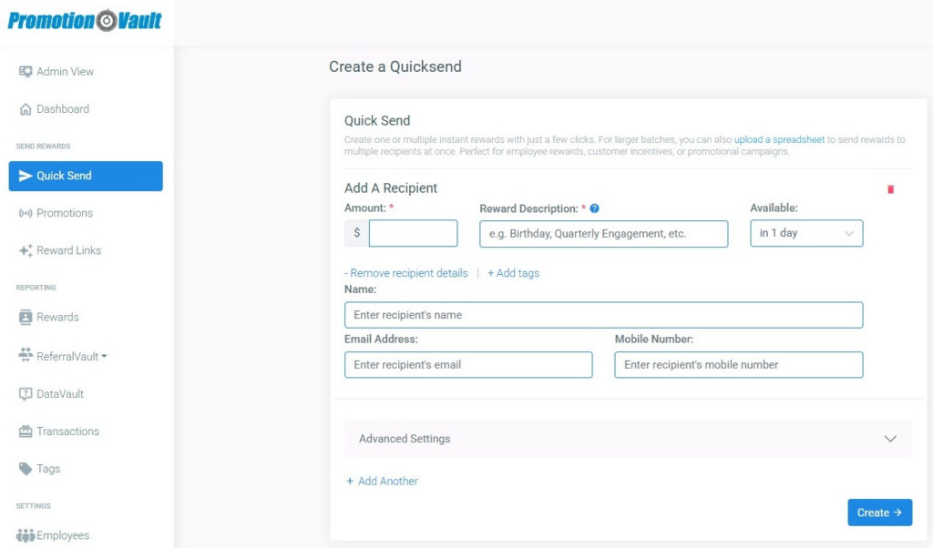 There are a few ways to send instant rewards using Promotion Vault. Simply choose the sending mode that matches your goals, then brand the experience and set any necessary tags or controls. All three options below are built into Promotion Vault and can be executed in minutes.