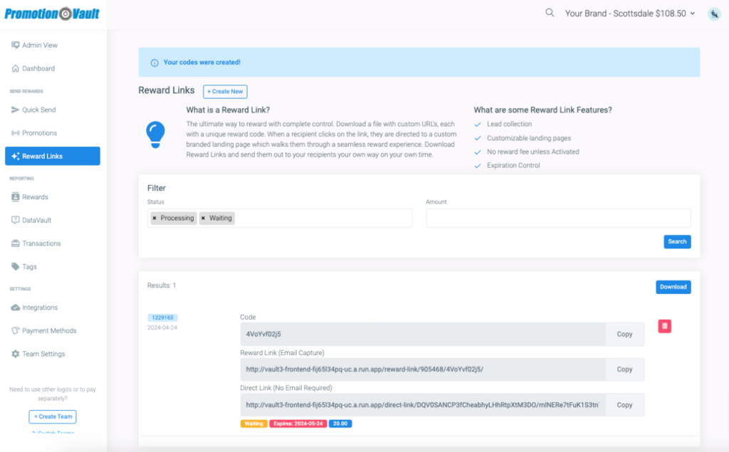 Result: Share unique URLs that drive to a branded landing page (or direct to Rewards Vault via Direct Reward Links); recipients self-redeem. Use Reward Links when you need flexible, on-your-time distribution.
